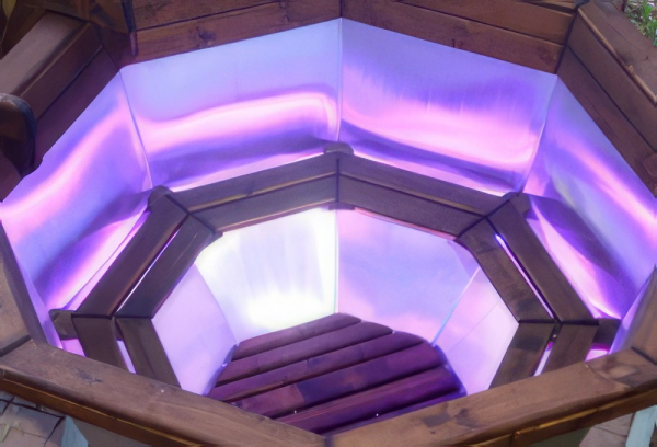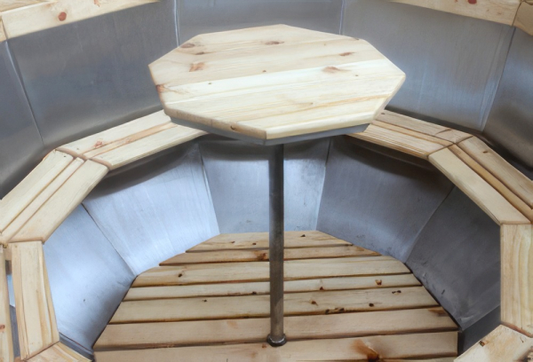 Банный чан на подставке изготовлен из пищевой стали. Представляет собой большую ёмкость в виде чаши, при нагревании которой можно париться на свежем воздухе. Чан установлен на устойчивую металлическую подставку и оборудован кедровым бортом, скамейками, подспинниками, трапом для ног и приставной лестницей. Нагревание банного чана происходит от обычного костра. Если оборудовать данную модель печью, то банные процедуры можно принимать даже зимой.