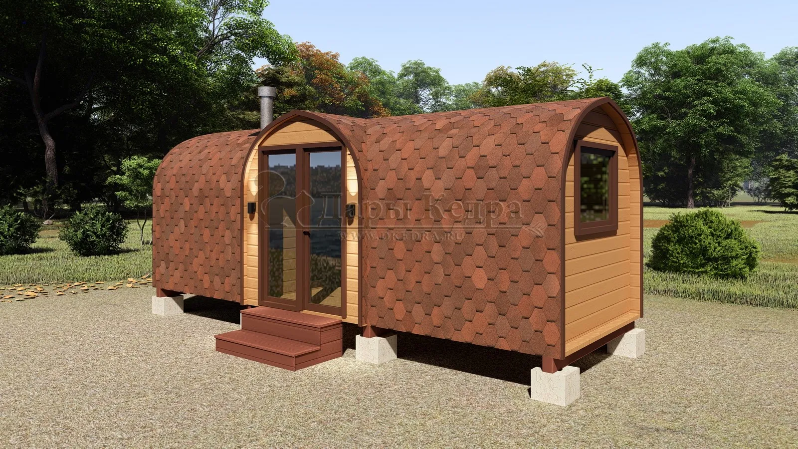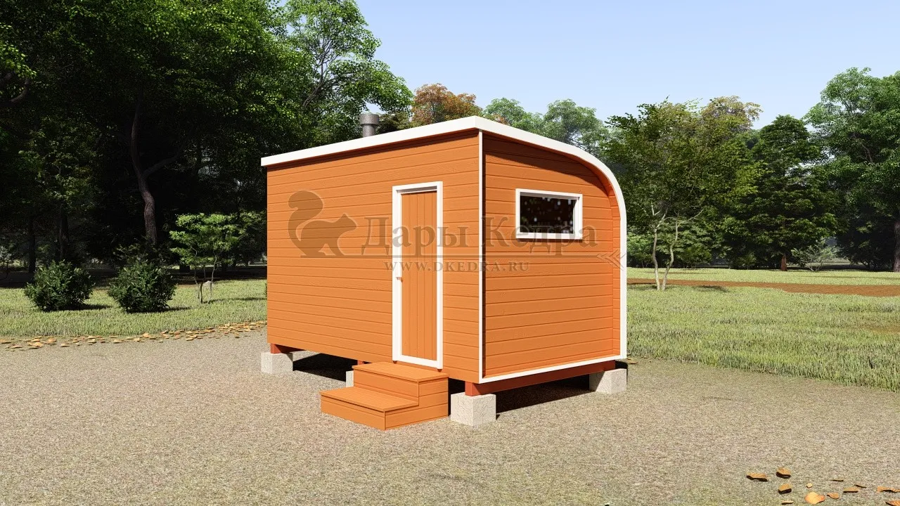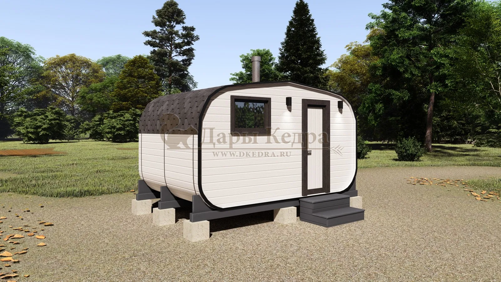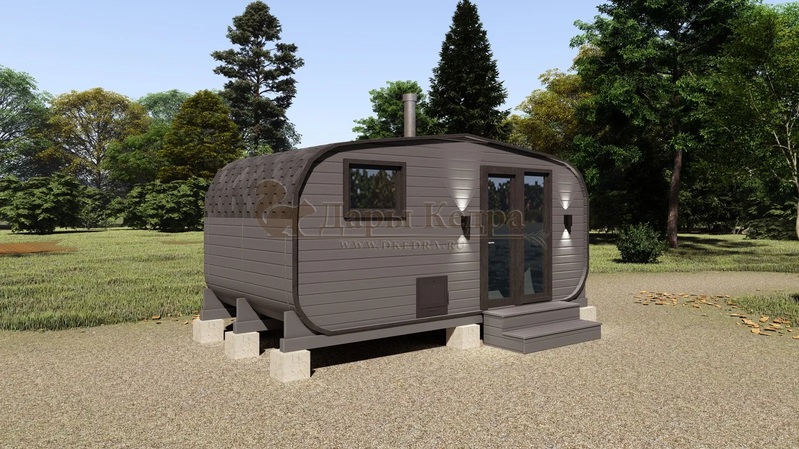 Симбиоз круглой и квадратной бани-бочки. Разработано с учётом эргономики, в ней так же просторно, как и в квадро-бочке, но при этом полукруглая крыша не дает задерживаться снегу и влаге на кровле. А еще такая баня безусловно красивая, мобильная и доступная каждому!