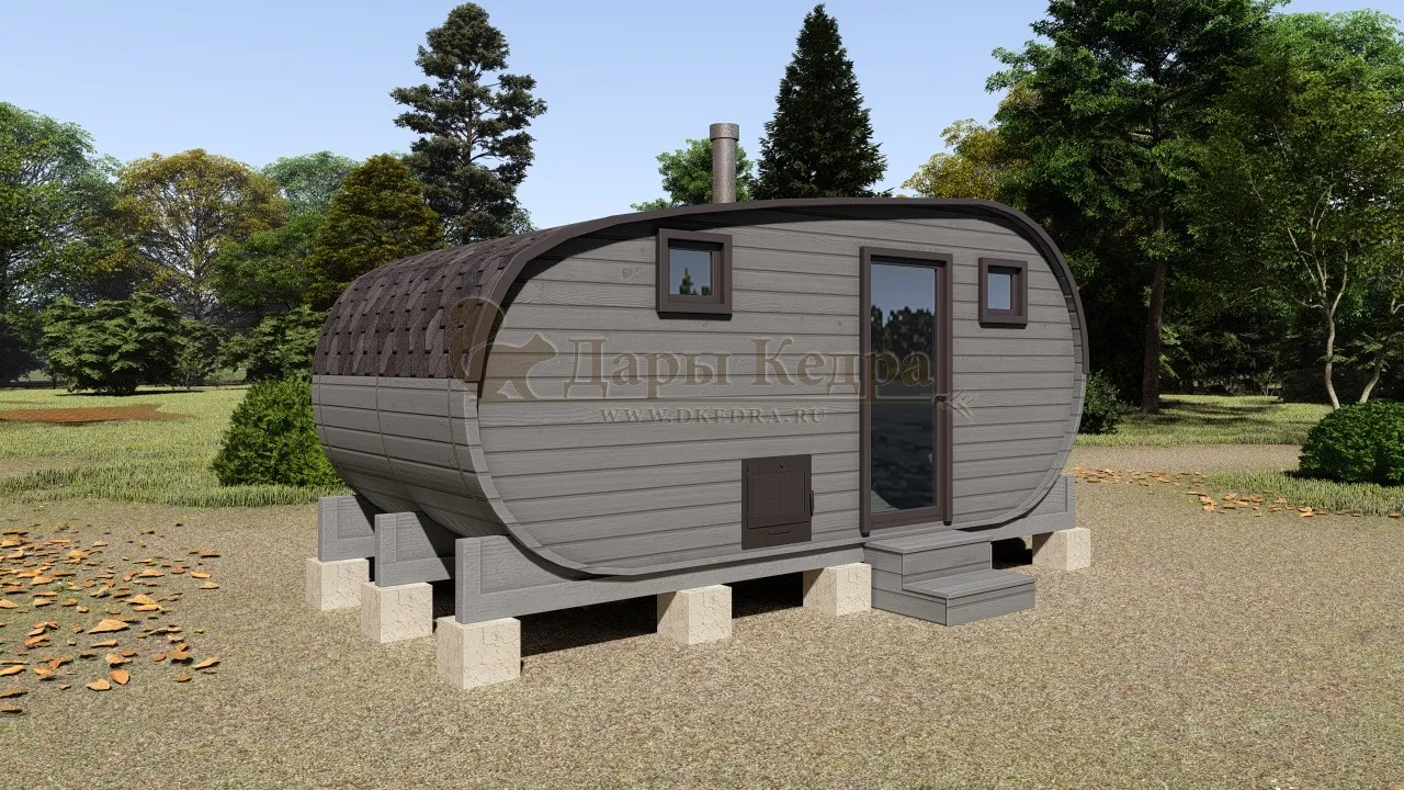 Баня-бочка круглая из кедра 3 метра Это изделие круглой вытянутой формы с двумя отделениями: раздевалкой и парной. Лавочки из кедра находятся по всей длине бани-бочки с обеих сторон. Печь расположена в парилке около дальней стены. Для удобства пользования в раздевалке установлена вешалка и полочка из кедра. За счет небольшой конструкции баня нагревается не более 30 минут. По вашему желанию баню-бочку можно дополнить печью с внешней загрузкой, благодаря которой весь мусор после топки останется на улице. Круглая баня-бочка не требует полноценный фундамент, поэтому при необходимости ее можно перенести в другое место. Обращаем Ваше внимание, что в стандартную комплектацию бани входят лавки в парной с обеих сторон. Дополнительно можно заказать полок открытого или закрытого типа! Кедр обладает ароматическими свойствами. Он не деформируется и влагоустойчив, при правильном уходе за деревом на нем не развиваются грибки и плесень.