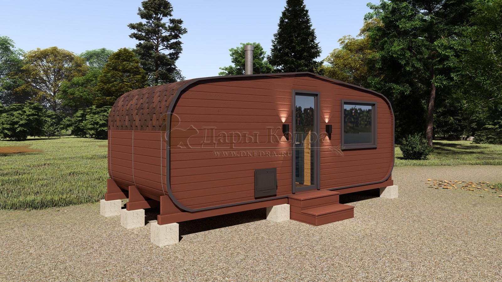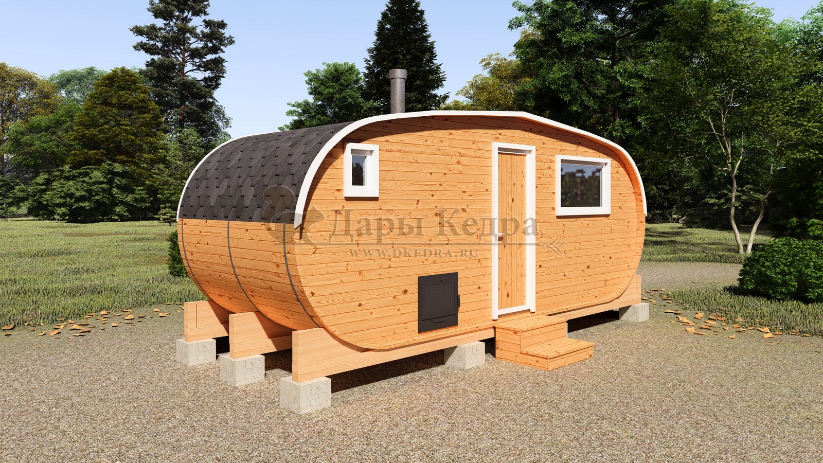 Баня-бочка буханка из кедра с козырьком (все размеры) Баня-буханка более просторная за счет увеличенной высоты потолков и ровного пола. Козырек не только украшает баню, но и защищает оставленную обувь от дождя. Лавочки из кедра находятся по всей длине бани-бочки с обеих сторон. Печь расположена в парилке около дальней стены. Время растопки такой бани не превышает 30 минут. В зависимости от выбранного размера баня-бочка буханка с козырьком имеет следующую комплектацию: Баня-бочка буханка 2,5 метра - парилка; Баня-бочка буханка 3,5 и 4,5 метра - раздевалка, парилка; Баня-бочка буханка 5,5 метров - раздевалка, парилка, моечная. По вашему желанию ее можно укомплектовать печью с внешней загрузкой, благодаря которой весь мусор вовремя топки остается на улице. Баня-бочка буханка не требует полноценный фундамент, поэтому при необходимости ее можно перенести в другое место. Обращаем Ваше внимание, что в стандартную комплектацию бани входят полки открытого типа в парной с обеих сторон. Дополнительно можно заказать полок закрытого типа или лавку! Кедр обладает ароматическими свойствами. Он не деформируется и влагоустойчив, при правильном уходе за деревом на нем не развиваются грибки и плесень.