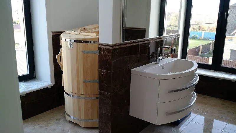Кедровая бочка (фитобочка) овальная со встроенным парогенератором «Профессиональная» Овальная форма этой кедровой бочки позволяет комфортно разместится даже высоким людям. Встроенный парогенератор исключает дополнительный монтаж. Ширина 78 мм позволяет занести бочку в помещение со стандартным проёмом в собранном виде. Толщина стенок 45 мм позволяет увеличить срок службы изделия. Подходит для коммерческого использования.