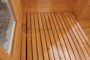 Домик с тремя помещениями подходит для дачного использования в теплое время года или обустройства загородных баз отдыха. Прихожая и кухня занимают одну комнату, в которой стоит стол из кедра. Две другие оборудованы четырьмя деревянными лежаками, по желанию их можно заменить на двуспальные кровати. Либо обустроить санузлом и душевой зоной. Для удобства пользования кемпинг дом можно укомплектовать верандой с лавочками или козырьком.