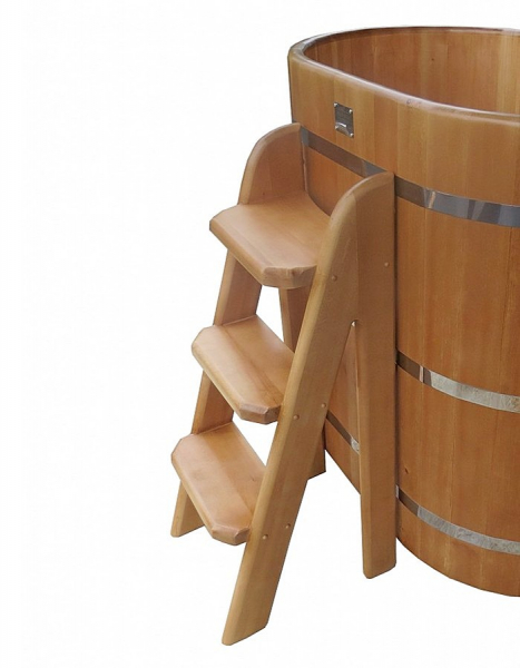 Приставная лестница с тремя ступенями и закруглёнными перилами обеспечит максимальный комфорт при входе и выходе из купели.